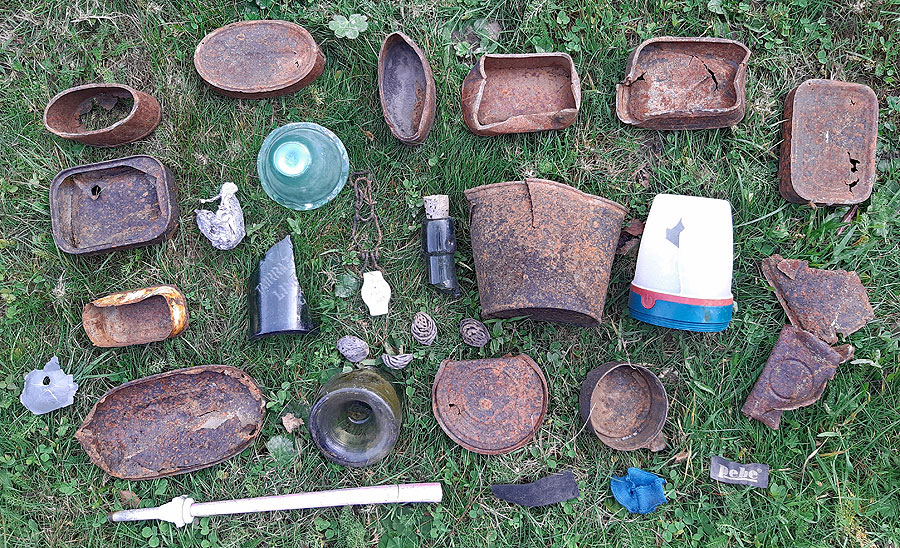 Fragments de verre, montre, conserves, plastiques, semelle, boussolle, carte de remontée mécanique...